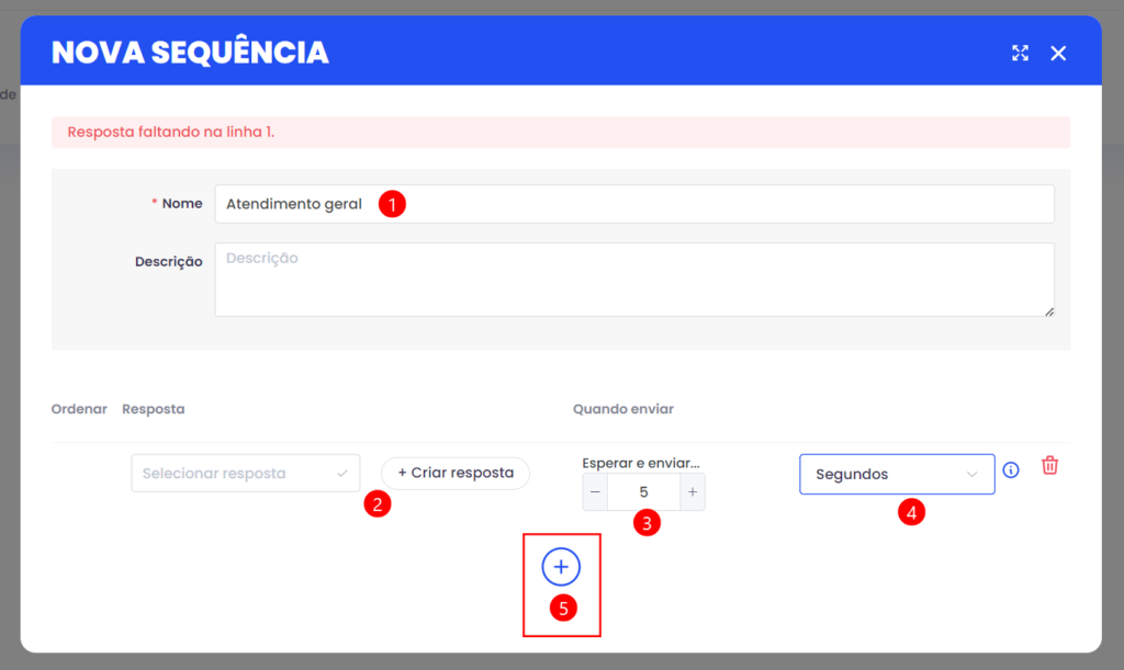 Caso deseje adicionar mais uma mensagem para fazer parte da sequência, clique no botão de + (5) e repita o procedimento quantas vezes for necessário.